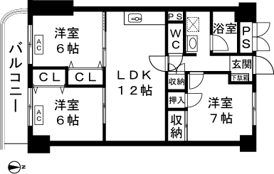 3LDK(洋室6帖、洋室6帖、洋室7帖、LDK12帖) / 72.15 m2(21.82 坪) |