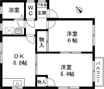 2DK(洋室6帖、洋室6.4帖、DK6.8帖) / 41.87 m2(12.66 坪) |