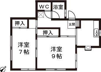 2K(洋室7帖、洋室9帖) / 40 m2(12.1 坪) |