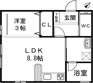 1LDK(洋室3帖、LDK8.8帖) / 28.92 m2(8.74 坪) |