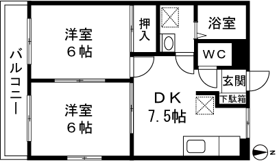 2DK(洋室6帖、洋室6帖、DK7.5帖) / 41.31 m2(12.49 坪) |