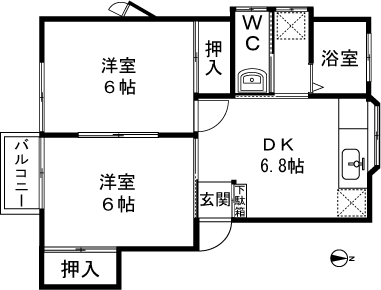 2DK(洋室6帖、洋室6帖、DK6.8帖) / 41.51 m2(12.55 坪) |