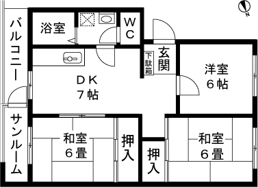 3DK(和室6畳、和室6畳、洋室6帖、DK7帖) / 60.03 m2(18.15 坪) |