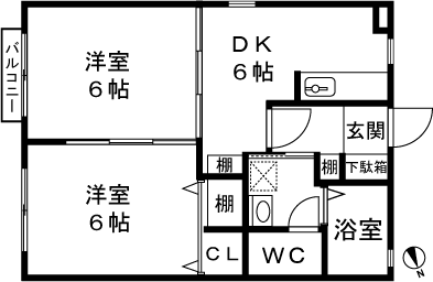 2DK(洋室6帖、洋室6帖、DK6帖) / 41.25 m2(12.47 坪) |