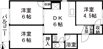 3DK(洋室4.5帖、洋室6帖、洋室6帖、DK6帖) / 50.38 m2(15.23 坪) |