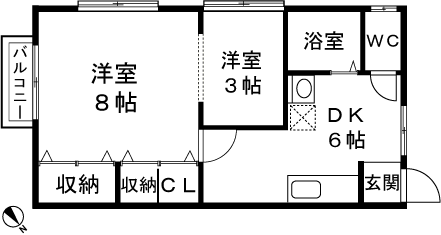 2DK(洋室3帖、洋室8帖、DK6帖) / 37.19 m2(11.24 坪) |