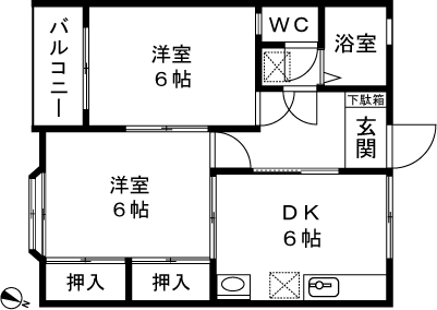 2DK(洋室6帖、洋室6帖、DK6帖) / 43.5 m2(13.15 坪) |