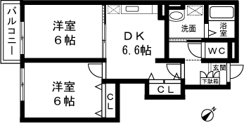 2DK(洋室6帖、洋室6帖、DK6.6帖) / 44.82 m2(13.55 坪) |